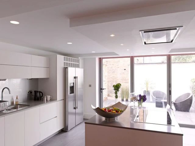 • Bespoke oversized handleless kitchens with integrated feature lighting and oak-finish high-level cabinets, including glazed display units