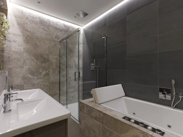 • Large-format porcelain floor and wall tiles, full-height around baths and showers